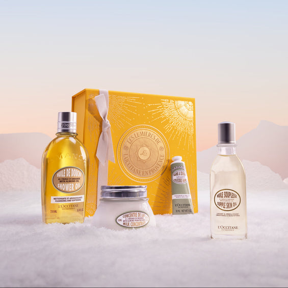 El Aceite de Ducha de Almendra es uno de los más amados. Su textura sensorial y su aroma cálido lo convierten en un regalo infalible.